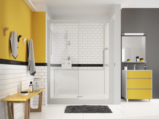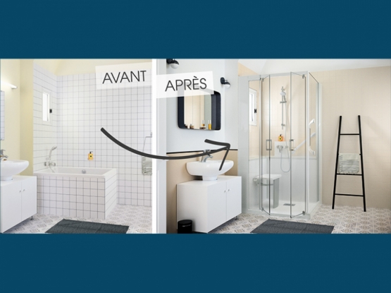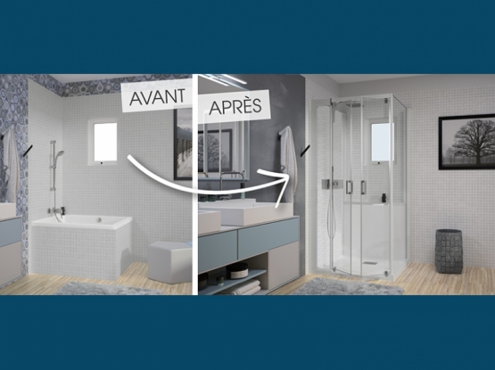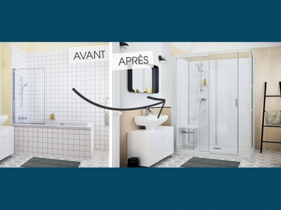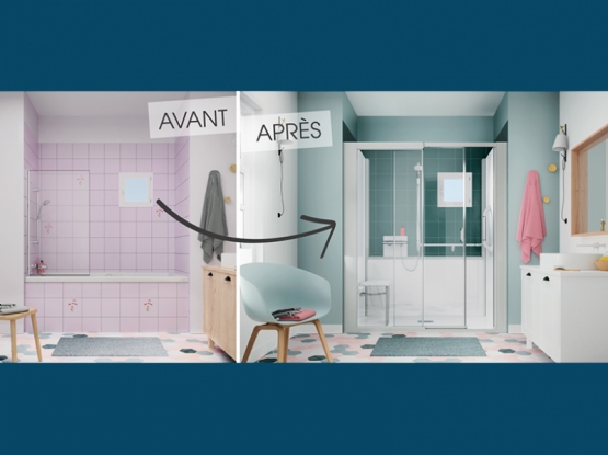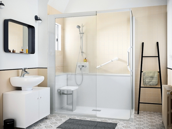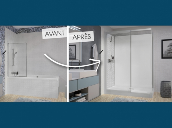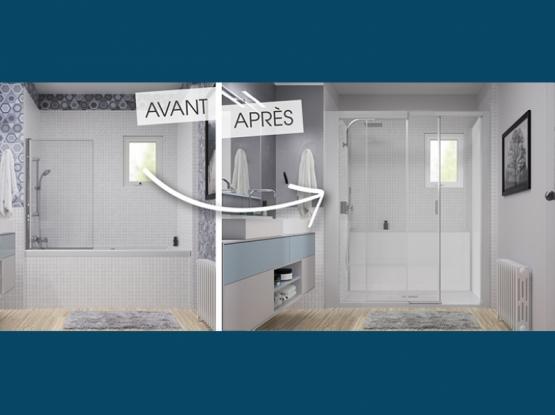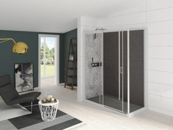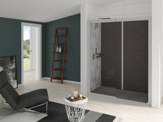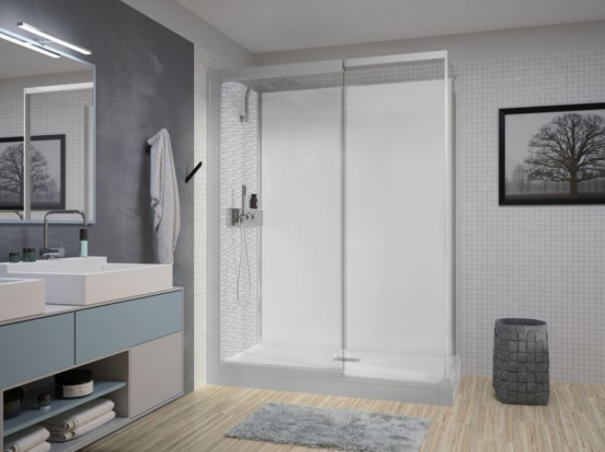 Pas de travaux préparatoires des murs et du sol : aucune reprise de faïence ou carrelage, ni ragréage nécessaires. Un espace de douche complet.