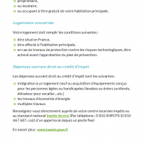 Si vous êtes fiscalement domicilié en France, vous pouvez bénéficier, sous conditions, d'un crédit d'impôt pour certaines dépenses d'équipement réalisées dans votre habitation principale. Il s'agit d'équipements pour personnes âgées ou en situation de handicap.